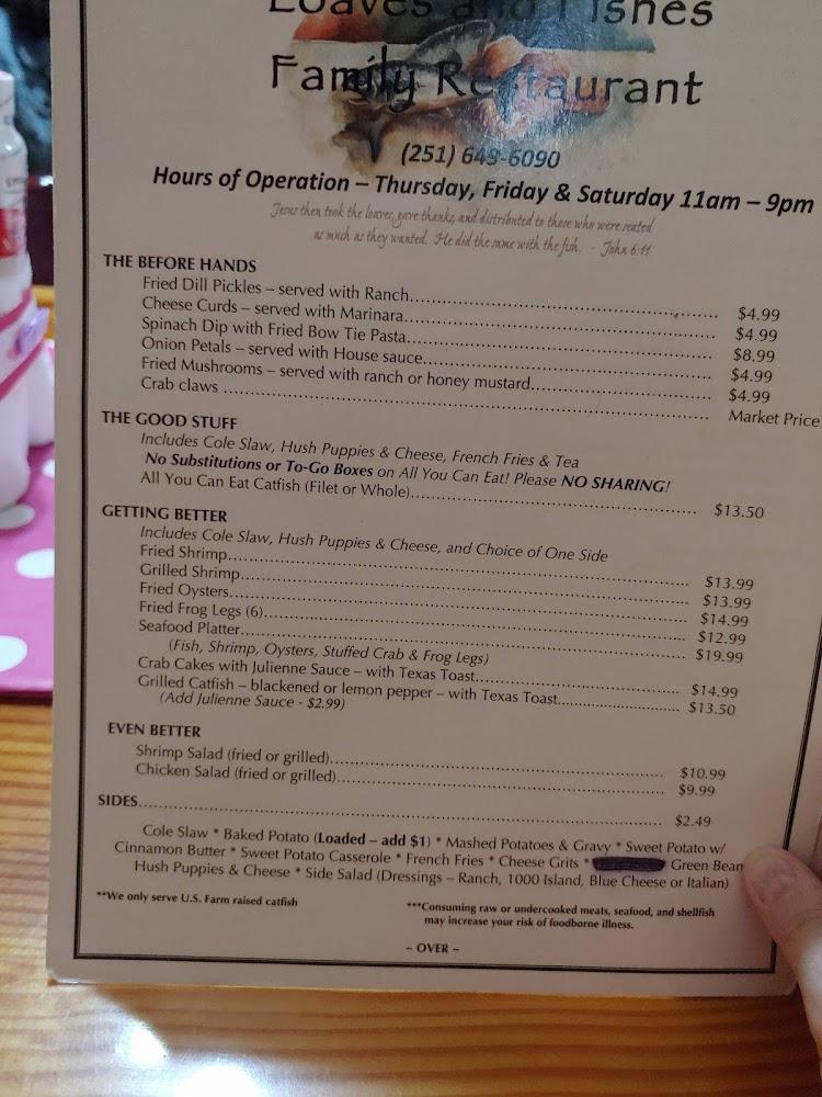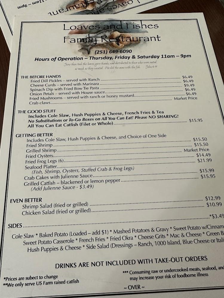 Welcome to Loaves & Fishes Family Restaurant, a charming eatery nestled in Wilmer, AL, where delicious flavors meet a warm atmosphere. Our menu features a delightful mix of American classics and fresh seafood, served with a side of southern hospitality. Enjoy a leisurely lunch or a cozy dinner, including an excellent café and delectable desserts that are sure to satisfy your cravings. With options for dine-in, delivery, and takeout, we cater to every need. Our inviting ambiance is perfect for families, groups, and solo diners alike. Visit us and experience why we’re a local favorite!
